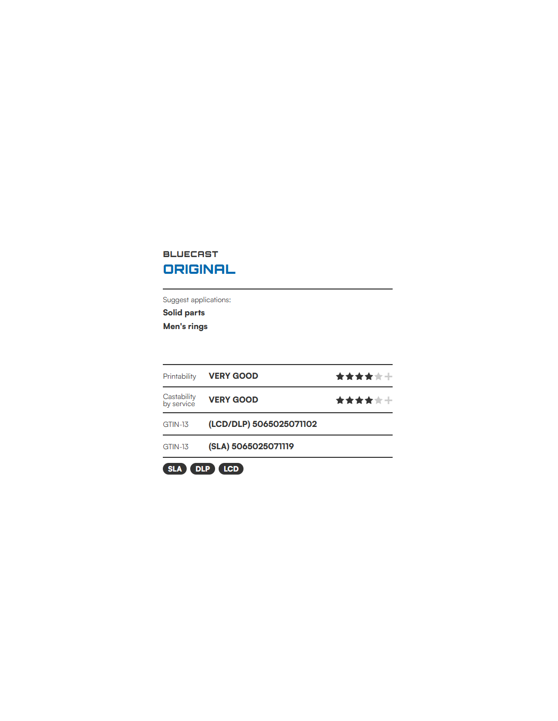 BlueCast Original ist ein langjährig erprobtes Resin für den direkten Feinguss (Direct Investment Casting), das Maßstäbe in der digitalen Schmuckfertigung gesetzt hat. Es wurde für Goldschmiedewerkstätten entwickelt, die ein zuverlässiges Material für die Serienfertigung von Standardmodellen, Trauringen und Komponenten suchen, bei denen Konsistenz und ein sauberer Abbrand unerlässlich sind.