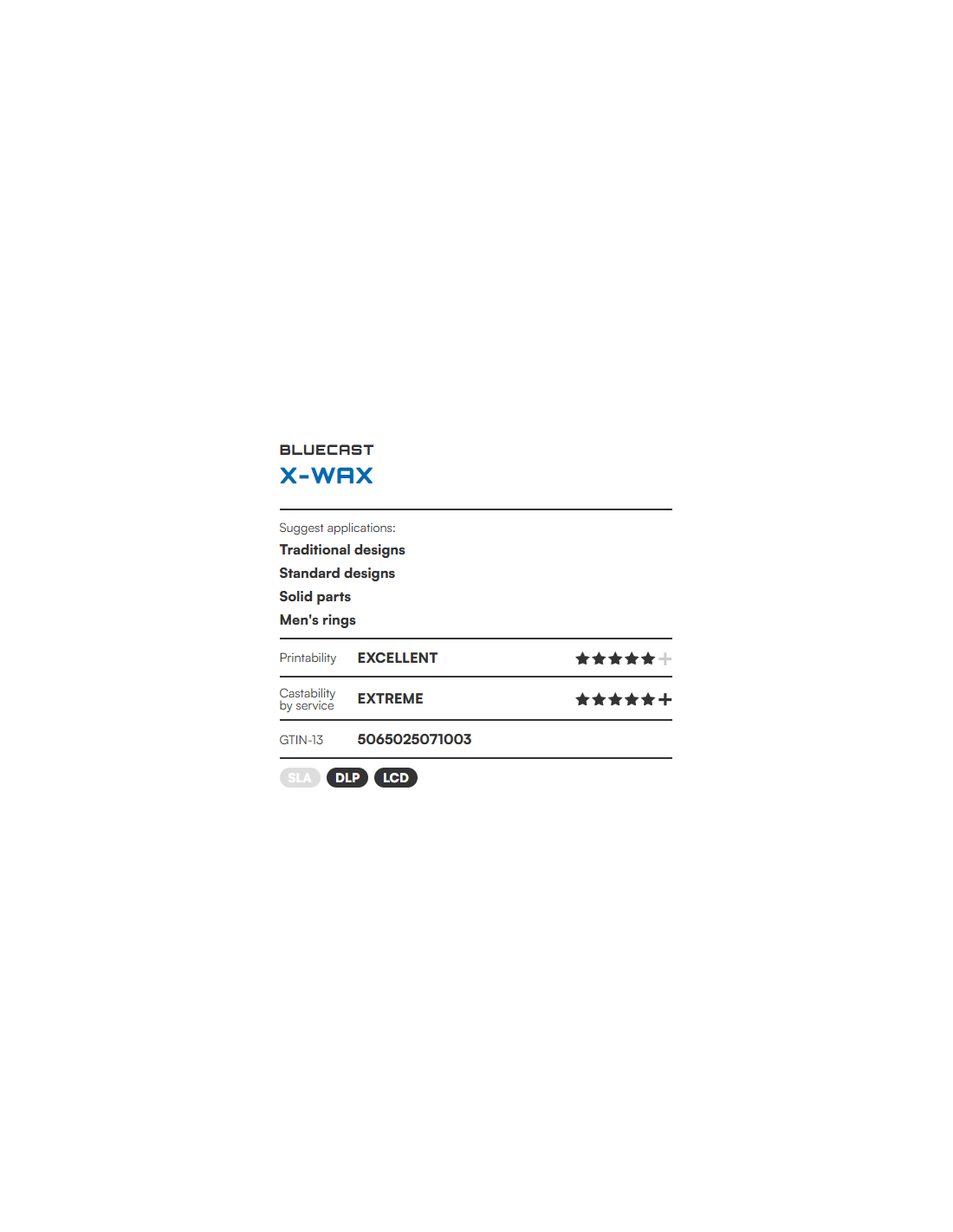 BlueCast X-WAX is a specialized photopolymer developed for precision investment casting requirements. Due to its high synthetic wax content, it is ideal for producing filigree, stone-in-place settings, and heavy organic pieces. It is fully compatible with monochrome LCD and DLP printers (e.g., Anycubic, Elegoo, Phrozen).
