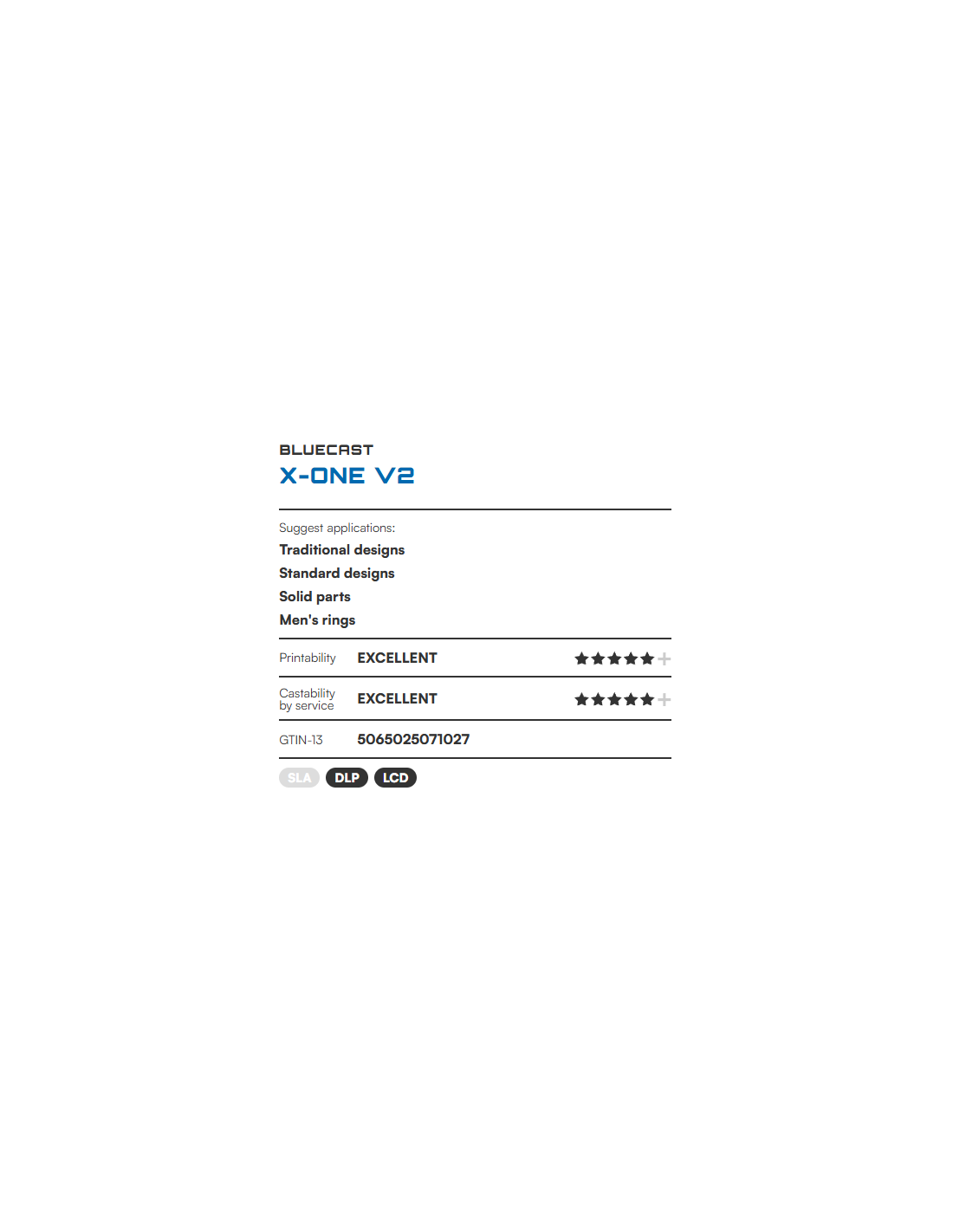 BlueCast X-One V2 je vyvinutý pre priame odlievanie (Direct Investment Casting) v zlatníctve a zubnej protetike. Je kompatibilný so všetkými monochromatickými LCD a DLP tlačiarňami. Umožňuje produkciu zložitých geometrií, filigránov a masívnych modelov s garantovanou rozmerovou stabilitou.
